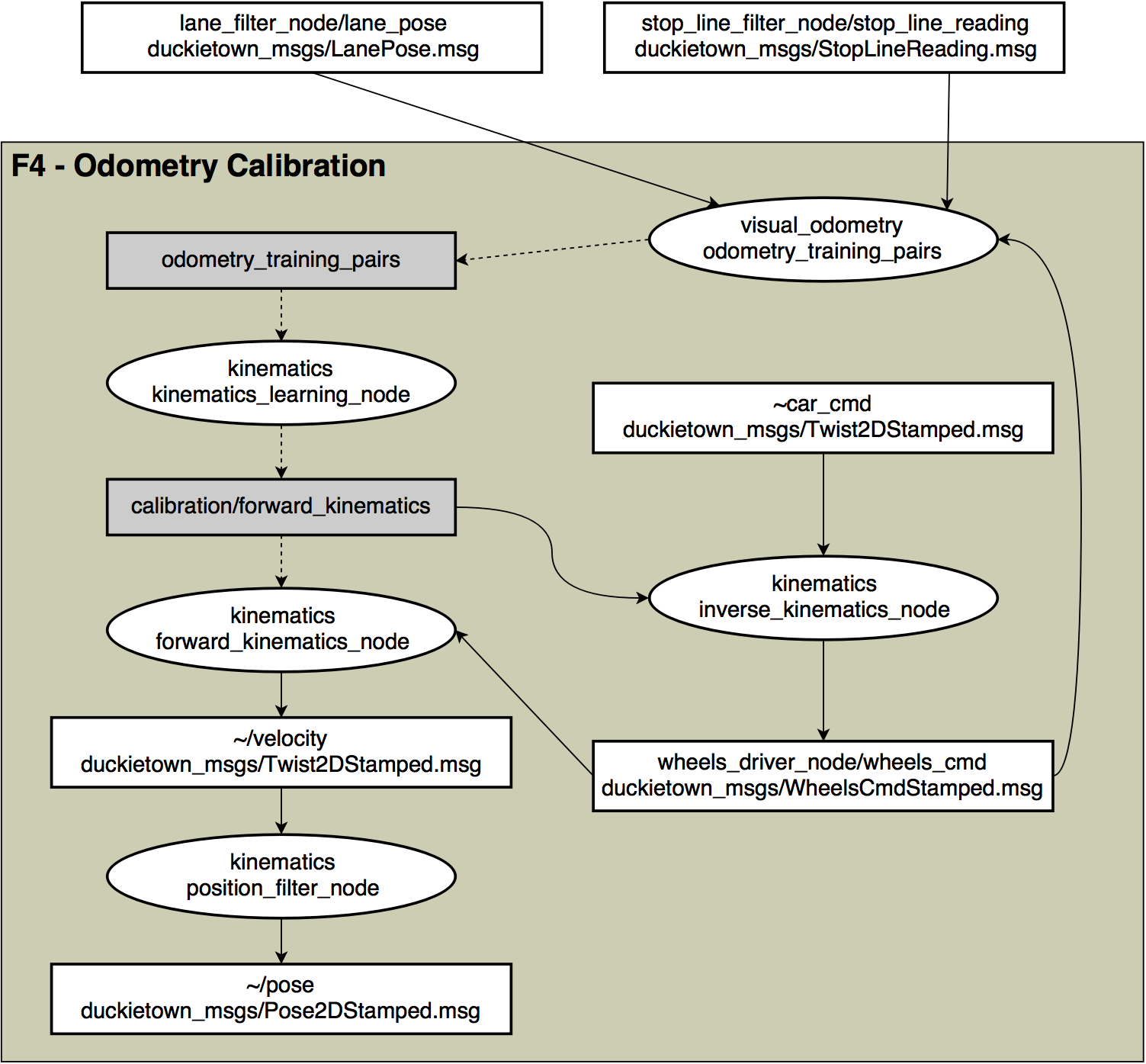 The task of system identification is performed in order to obtain a kinematic model for each robot. An accurate kinematic model is necessary so that the robot can successfully and smoothly navigate areas with little or no information from the camera, its only sensor. For example, since the lane-finding algorithm uses the painted lines on the road, when the robot navigates an intersection it relies completely on its kinematics model to dead-rekcon and arrive at the correct lane. The only data available for system identification, however, is the camera image and the voltage input to each wheel’s motor. Two challenges we encountered where: 1, that the motors themselves, being very inexpensive ones, had a significantly time-varying behavior, likely related to the motors heating up; and 2, the very limited computing power of our Raspberry Pi computers together with the homogeneity of the “road” forced us to detect only lane markings from the compressed camera image for odometry measurements, resulting in very noisy odometry data.