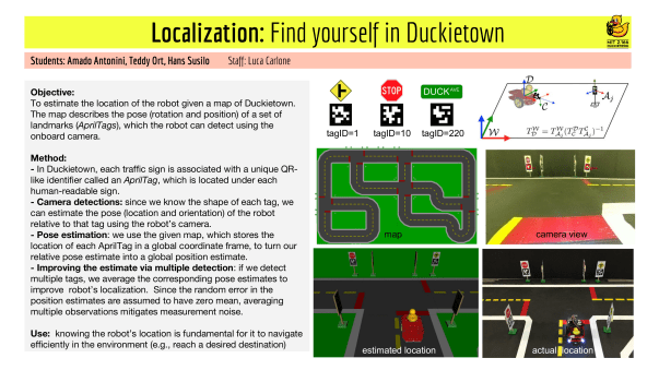 The localization system was needed in the same way a GPS signal is used for driving in a city. We used unique fiducial markers (AprilTags) placed at each intersection and recorded their location with respect to a predefined frame (offline). When each robot sees one of the AprilTags, it measures its pose with respect to the tag to compute its global pose. My contribution was to define a consistent yet concise representation of the city map and street signs and to automate the generation of a dictionary of transforms of all the tags in a city. This automation made it possible to quickly create digital representations of any Duckietown format with arbitrarily placed street signs (AprilTags).