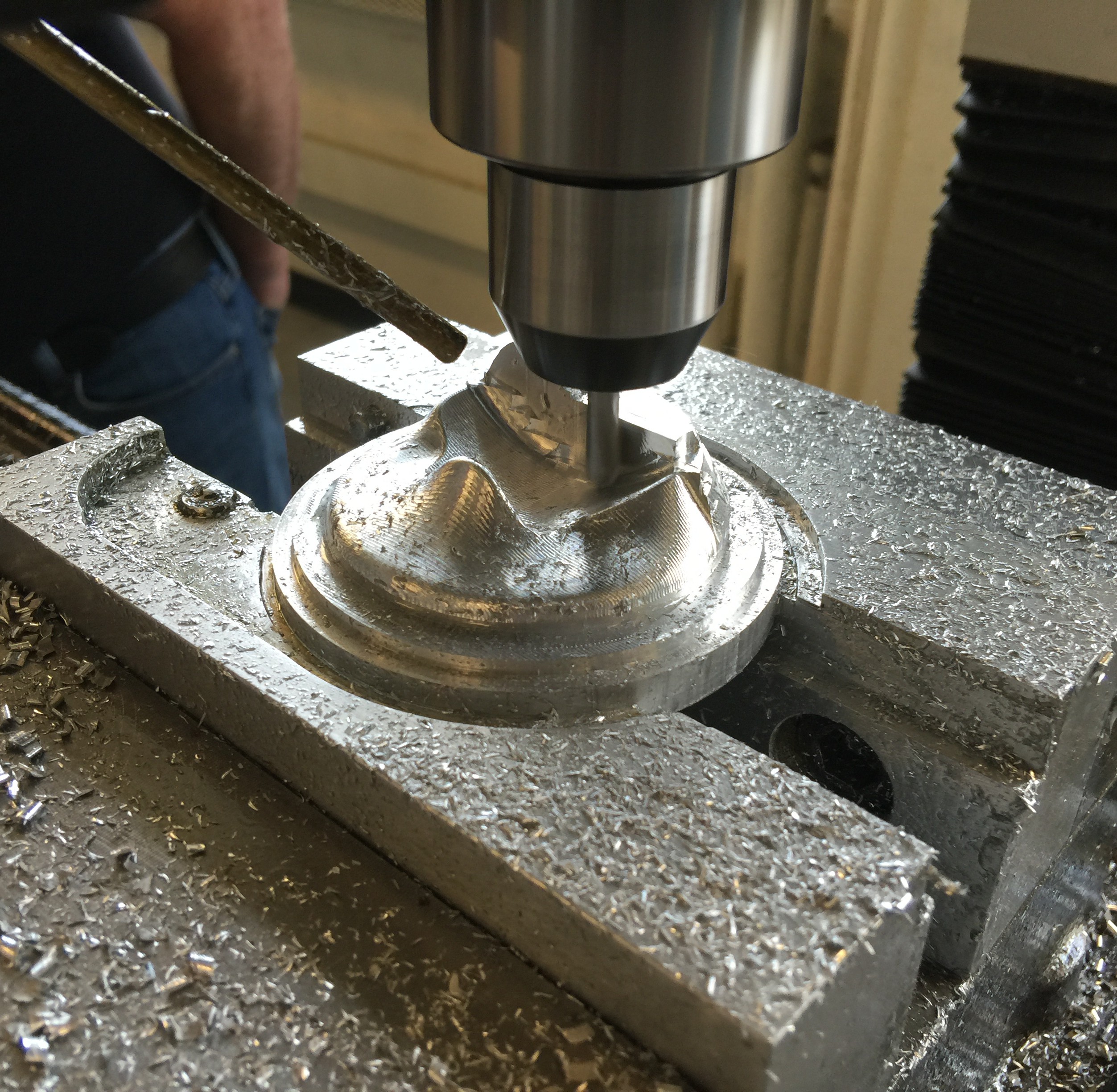 Then, I designed the stand to resemble the milk when the cookie is dipped in it. For this, I used AutoCAD because its mesh tools are ideal for this kind of shapes. Then I used MasterCAM to produce tool paths from the CAD model to make the mold to be used for thermoforming (note that the final version was scaled down from that shown in the renderings above). We used a CNC lathe and a CNC mill with these tool paths to produce the following mold.