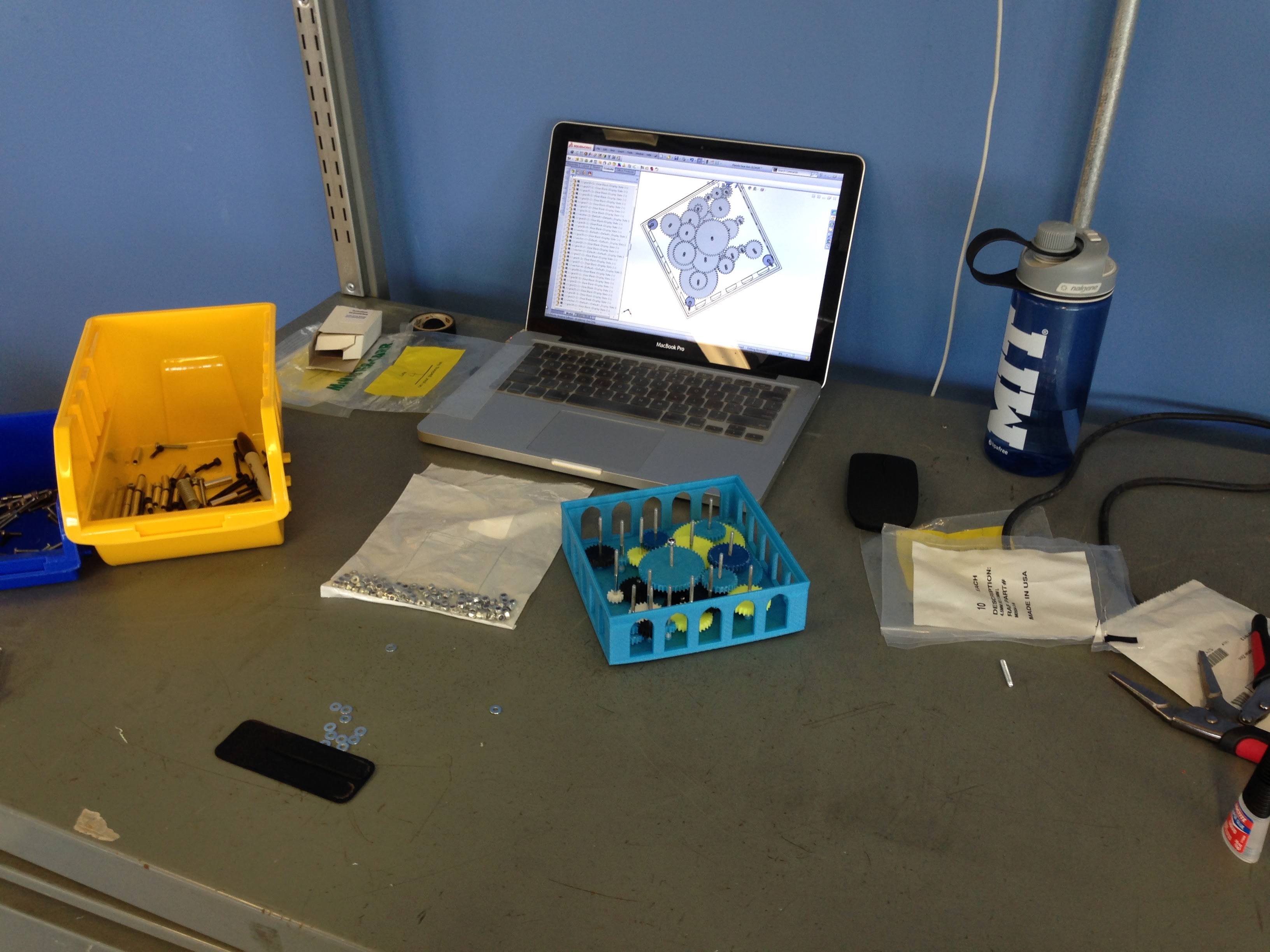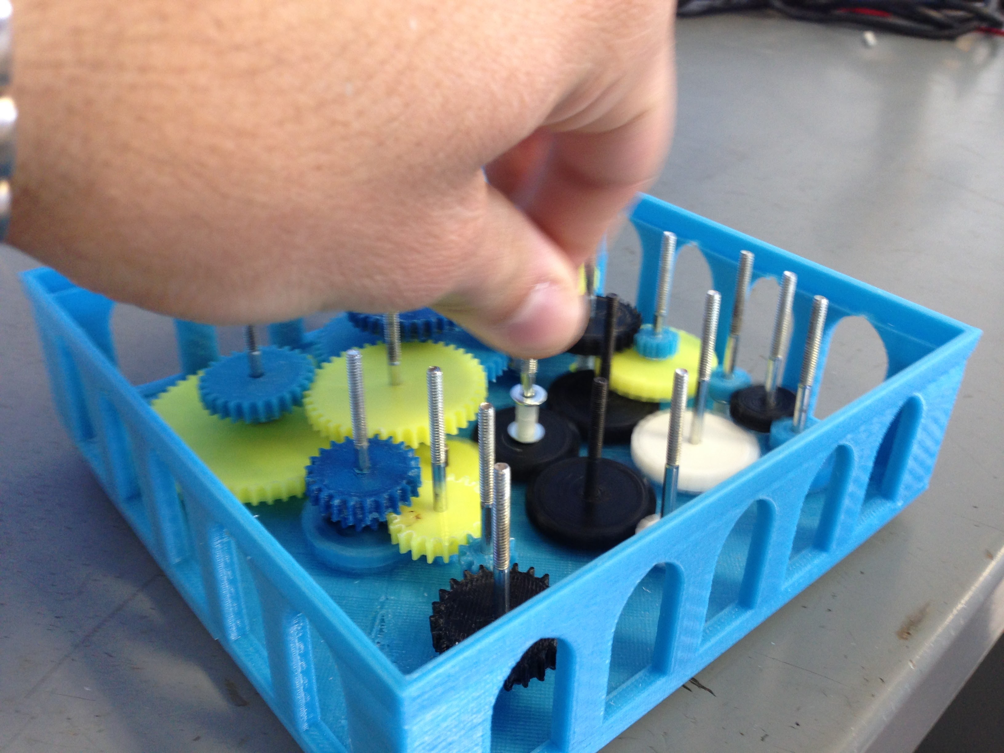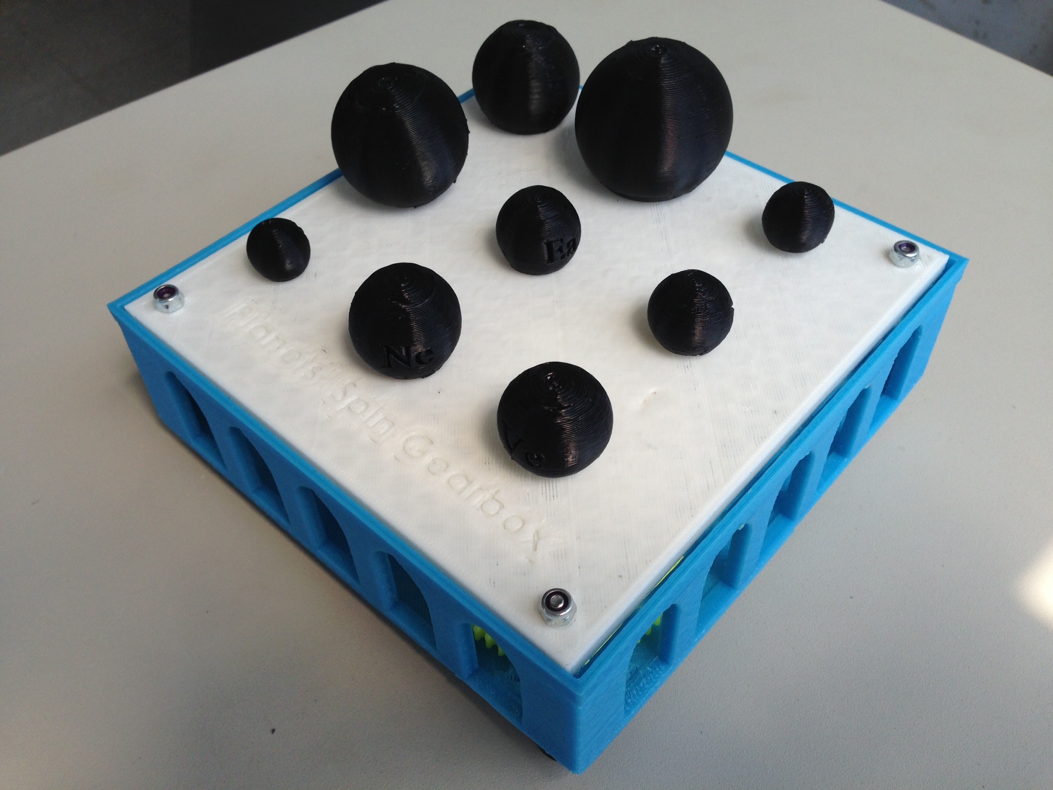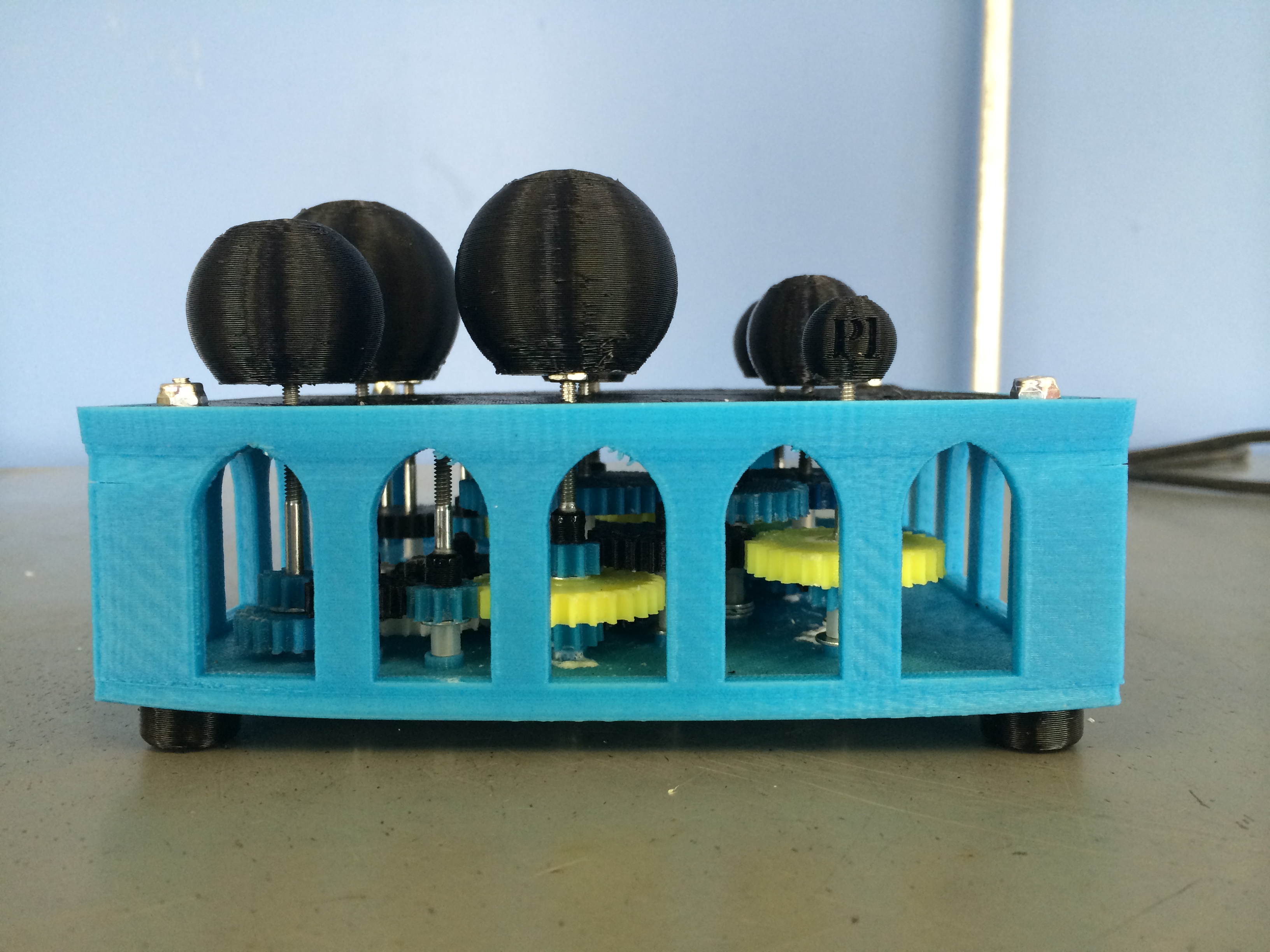 This is a gearbox made out of 3D-printed components and metal shafts. I made at New Valence Robotics Corporation to demonstrate the value of 3D printing in education. It is designed so that each “planet” (the black spheres on top) rotate at the correct relative speed with respect to the other planets.