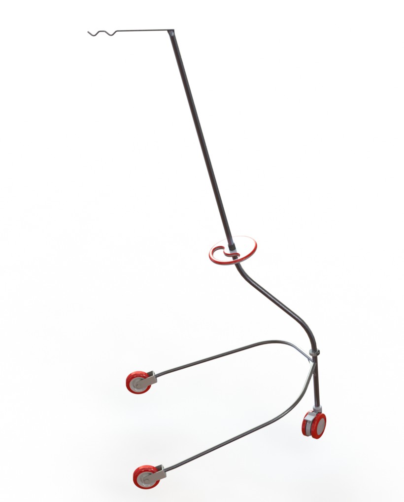 This next version of Trellis was intended to be easily maneuvered single-handed and also to have a small base. The small base would be achieved by storing most of the liquid at the bottom and having a non-intrusive pump refilling a small IV bag at the top for the medication to be delivered by gravity.