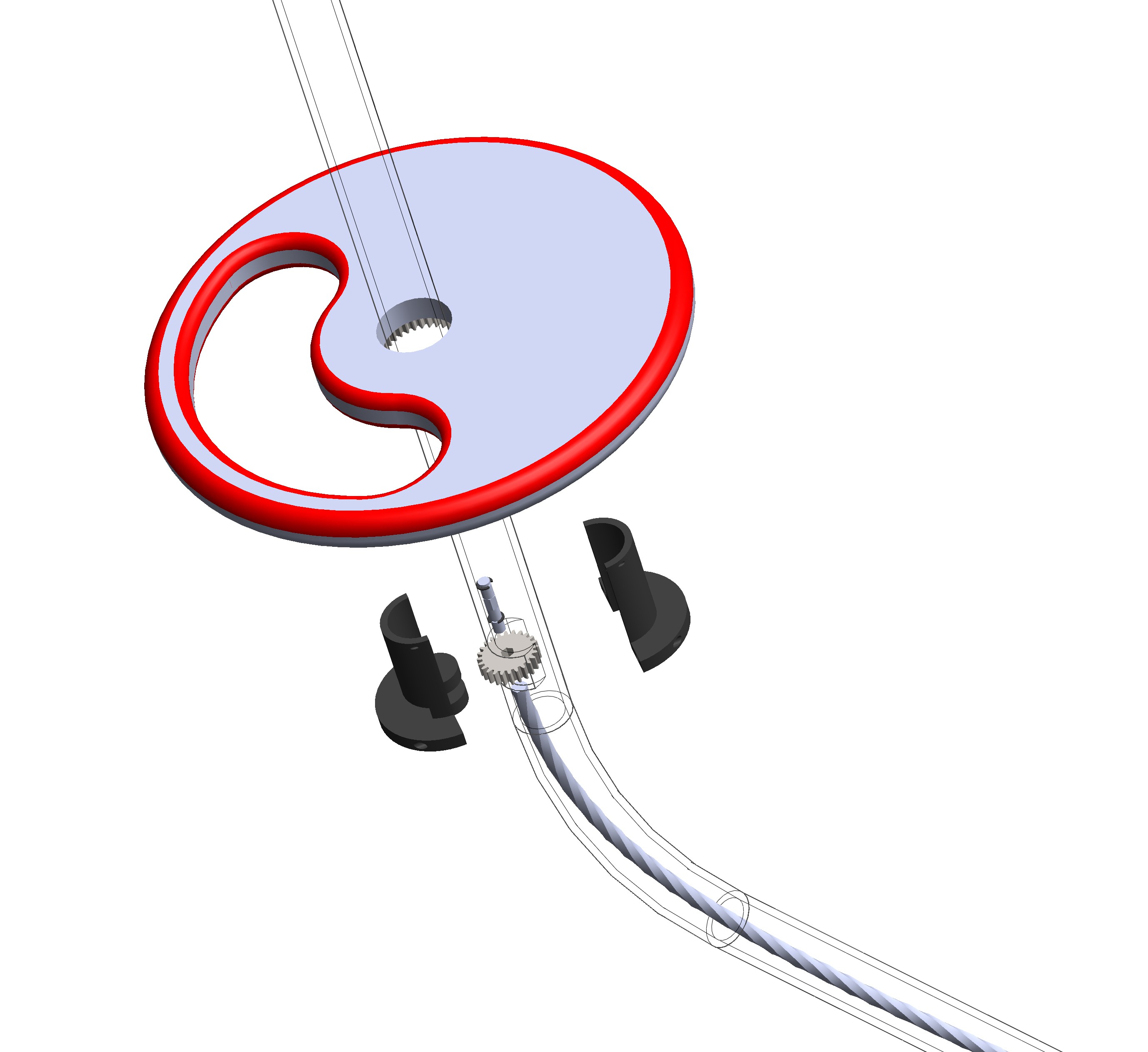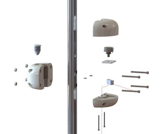 The tether is attached on the pole’s end to a string potentiometer to measure distance, and it goes through a regular potentiometer, inside the tether device (below), to measure angle. This design of tether allows for measuring about 220˚. I designed the tether device to be 3D printed.