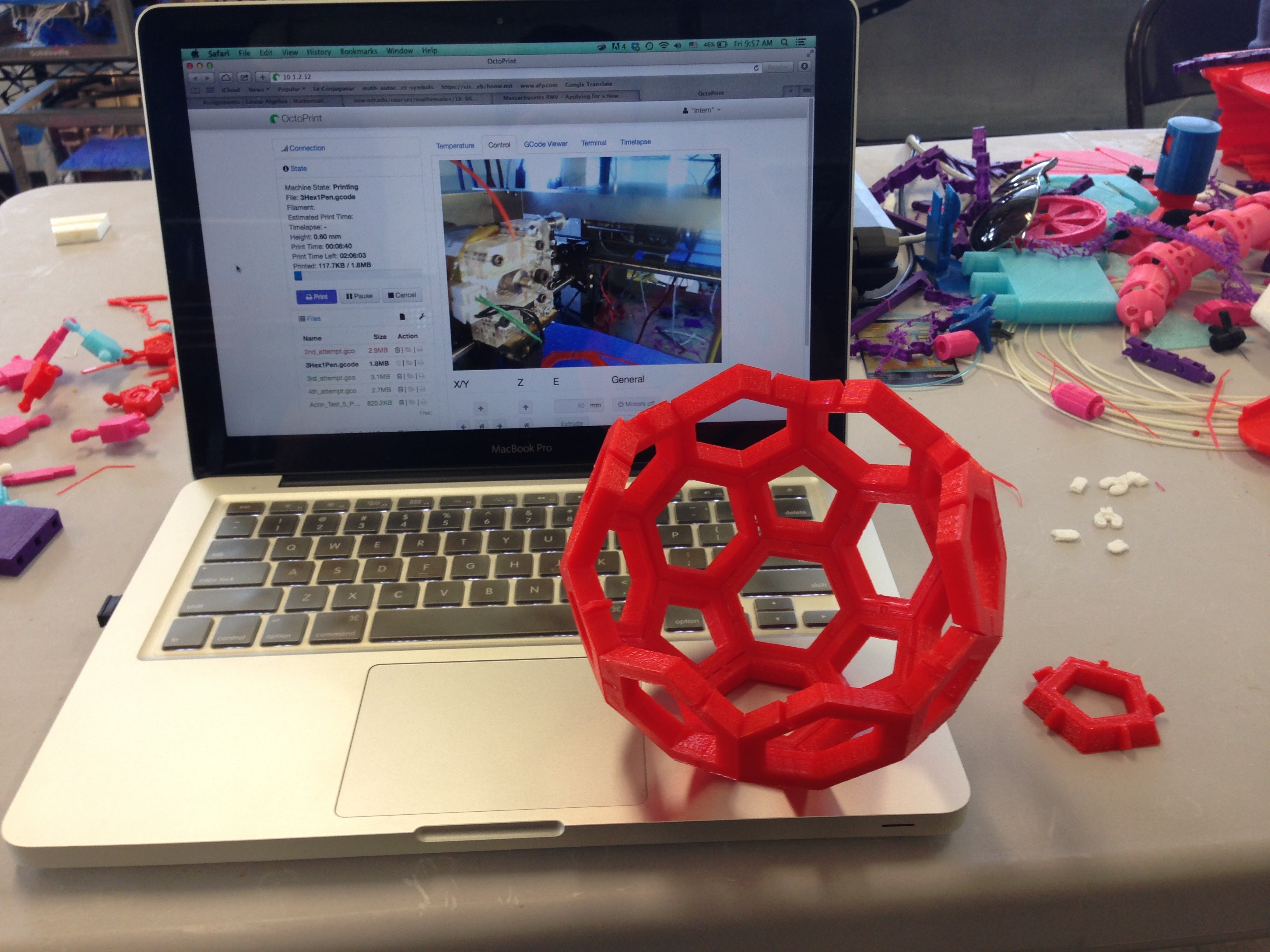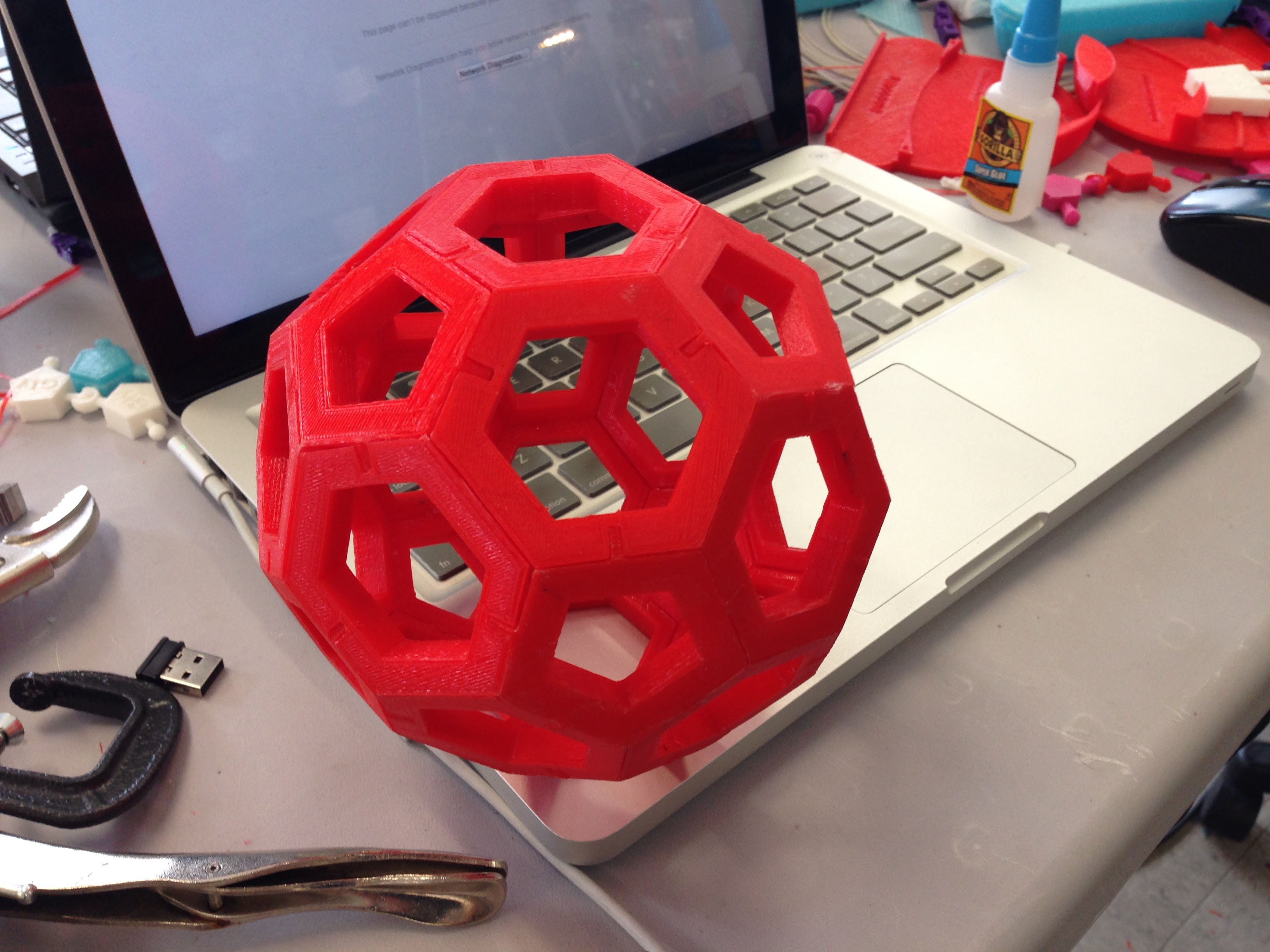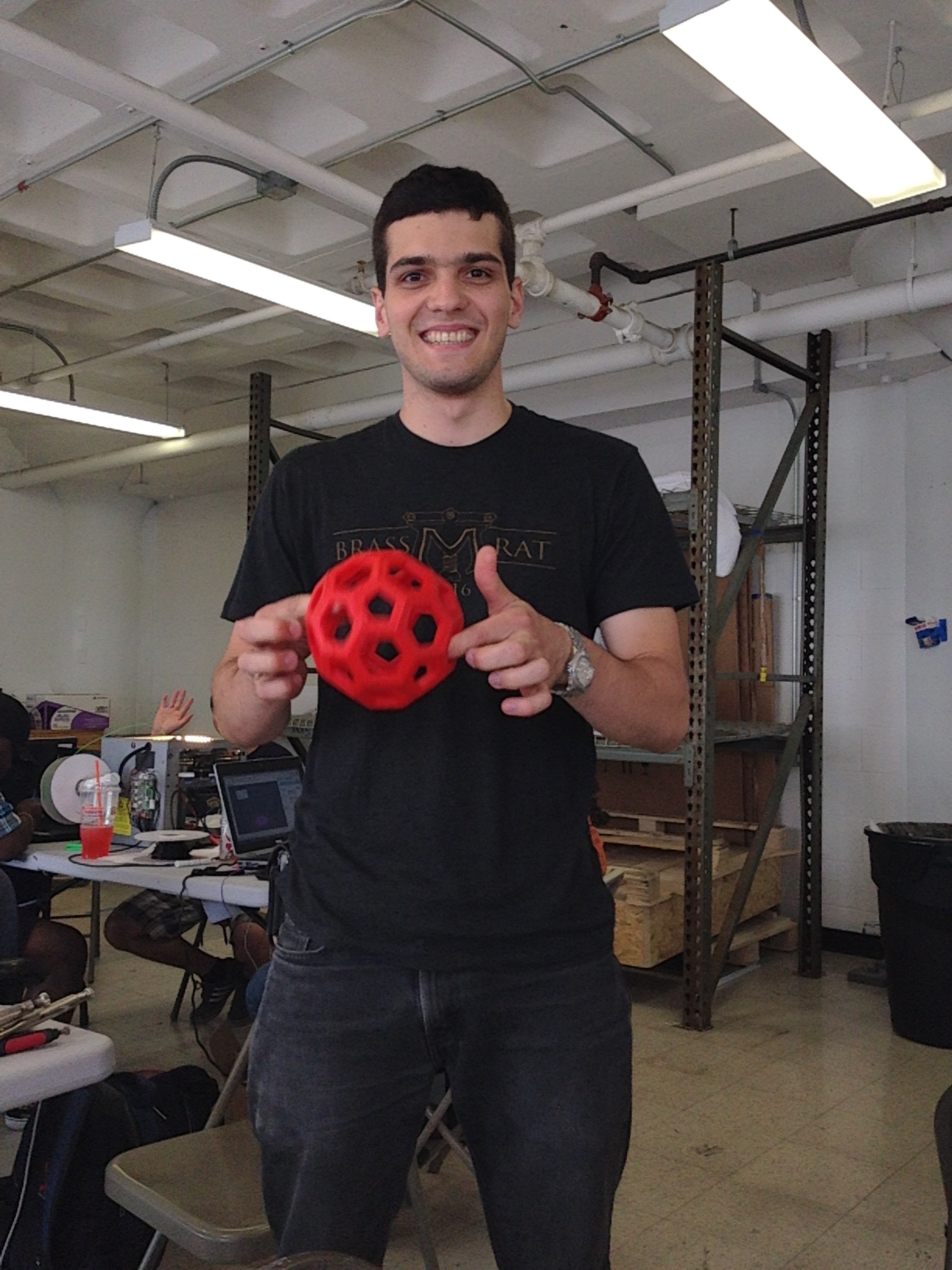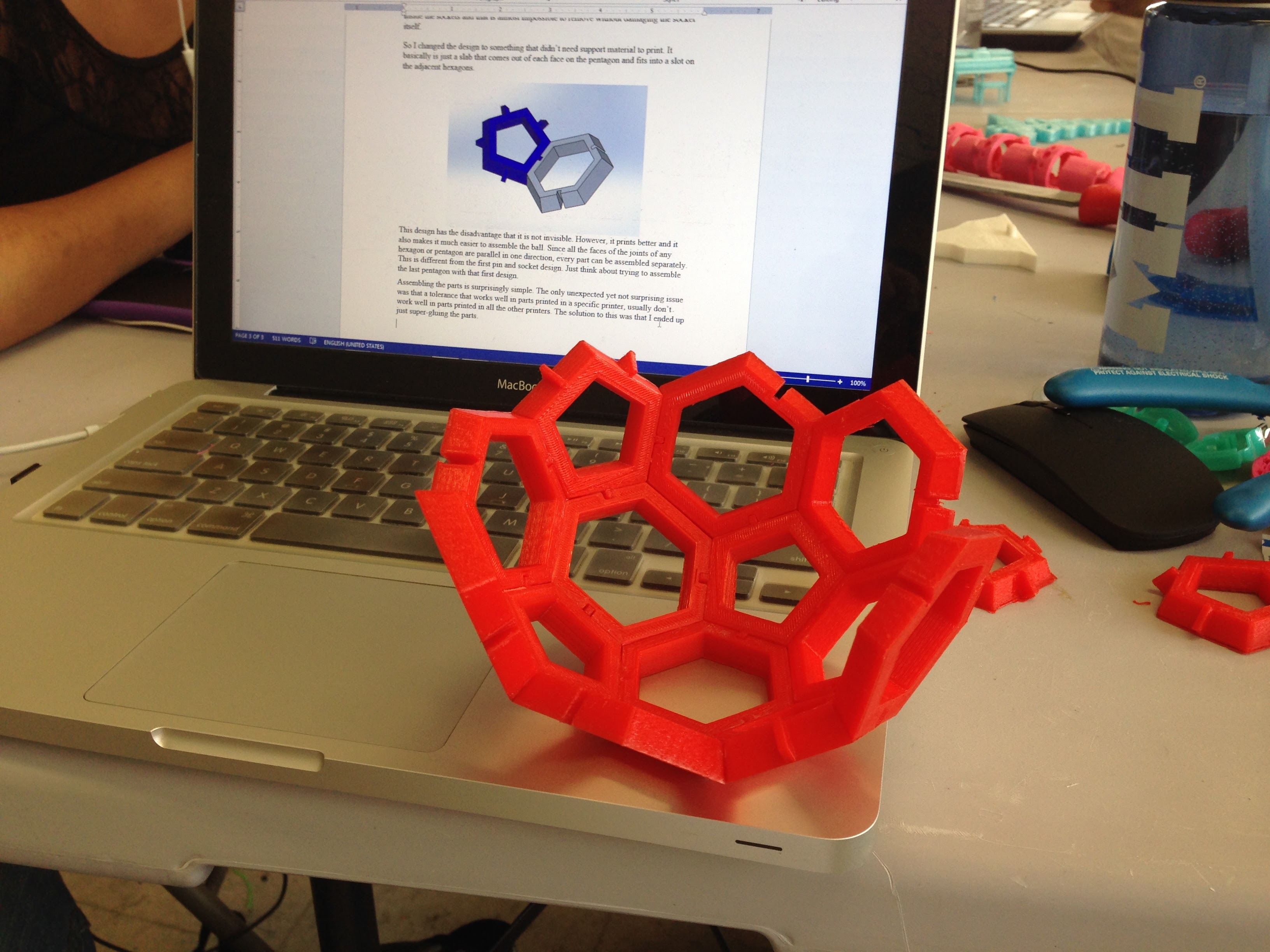 A truncated icosahedron made from 32 3D-printed pieces I made during my internship at New Valence Robotics Corporation. This is the traditional shape of soccer balls. The individual pieces interlock to form the “sphere”.